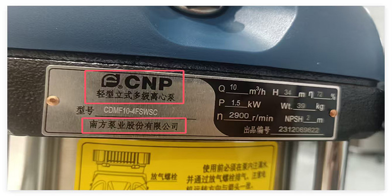 每台正品CNP南方泵都有官方铭牌,铭牌上印有南方泵业股份有限公司以及CNP的商标!
