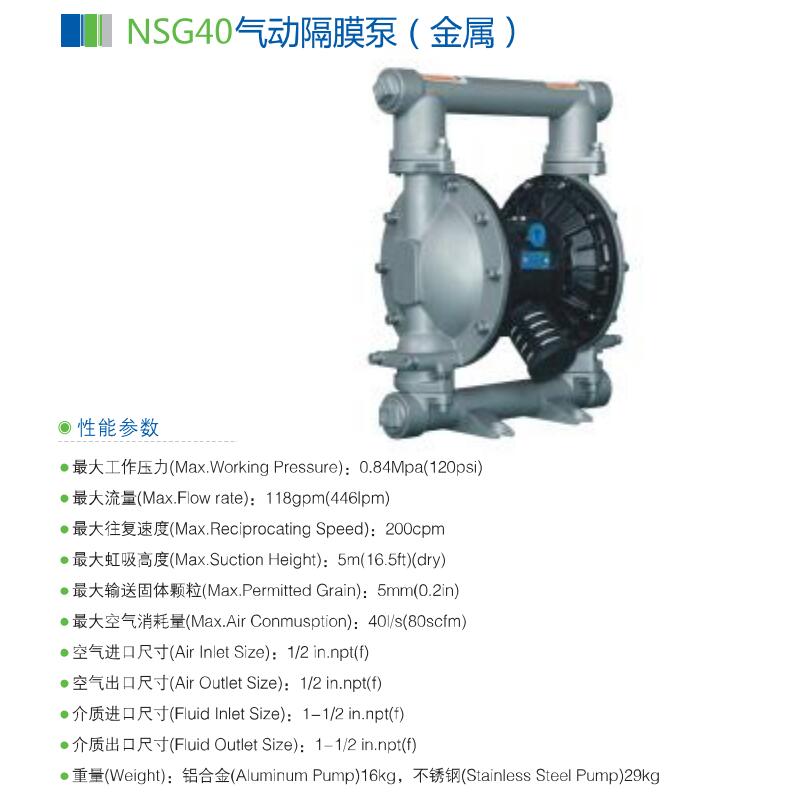性能及优点:气动隔膜泵具有简单、高可靠设计的空气换向阀,使得整个隔膜泵系列产品能在各种应用工况下实现最大的可能性。换向阀分为三向先导阀,能保证真正意义的不发粘,所有部件可在不打开液体腔的情况下进行更换